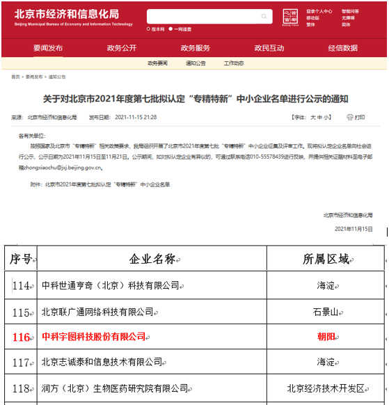 喜報!中科宇圖成功入選北京市2021年度 “專精特新”中小企業名單
