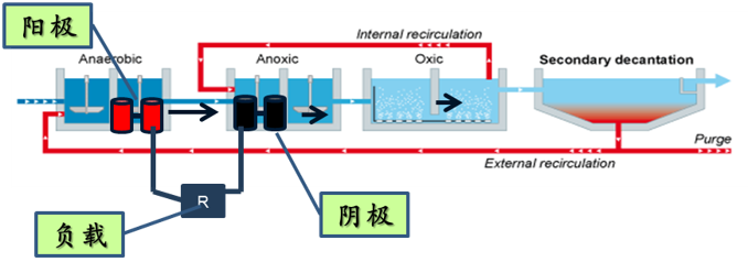 MFC同步的脫氮除碳—陽極利用微生物去除有機(jī)物產(chǎn)生電子,同時在陰極(生物陰極)利用硝酸鹽還原菌催化硝酸鹽還原,從而實現(xiàn)在去除有機(jī)物的同時,脫去污水中的氮。
